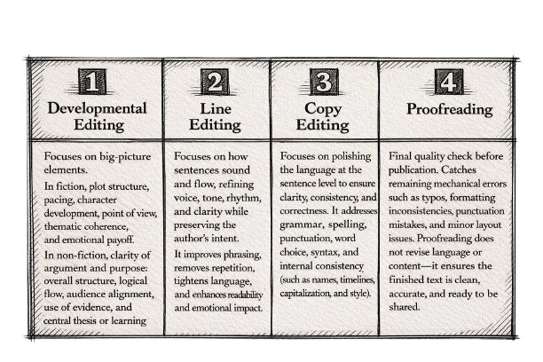 Editing is the professional, systematic process of evaluating, refining, and improving a written work so that its ideas are clear, coherent, effective, and appropriate for their intended audience, purpose, and medium. At its core, editing addresses both what is being communicated and how it is communicated, moving along a continuum from big-picture concerns—such as structure, logic, argumentation, narrative development, and scope—to fine-grained details like tone, clarity, consistency, grammar, style, formatting, and accuracy. Editing is not merely error correction; it is an interpretive and analytical act in which an editor reads as an informed, attentive surrogate for the reader, identifying gaps, ambiguities, redundancies, misalignments, and missed opportunities, and then making or recommending changes that strengthen meaning, flow, credibility, and impact. Depending on the stage and goals of a project, editing may involve diagnosing conceptual or organizational issues, reshaping paragraphs or sentences for clarity and emphasis, enforcing stylistic and disciplinary conventions, or ensuring technical precision and correctness. Throughout this process, our editing endeavors to respect your voice, intent, and ownership of the work, intervening not to replace your ideas but to help them emerge more fully, accurately, and persuasively—so the final text or body of work communicates exactly what it needs to, as effectively as possible.