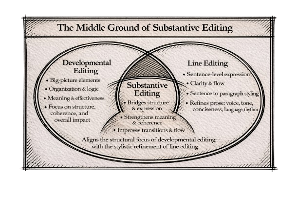 Substantive editing occupies the middle ground between developmental editing and line editing, acting as a bridge between big-picture structure and sentence-level expression. Like developmental editing, it is concerned with meaning, logic, organization, and effectiveness—examining whether ideas are fully developed, sections are well ordered, arguments or narratives are coherent, and transitions support the reader’s understanding—but it typically works within an already established overall structure rather than redesigning it from the ground up. At the same time, substantive editing overlaps with line editing because it often requires direct intervention at the paragraph and sentence level to clarify emphasis, improve flow, resolve ambiguities, or strengthen coherence; however, those sentence-level changes are made in service of content and structure rather than purely stylistic refinement. In practice, substantive editing functions as the connective tissue of the editing process: it translates developmental insights into concrete textual changes and prepares the manuscript for a more purely stylistic line edit by ensuring that what is being said is sound, complete, and logically arranged before attention turns primarily to voice, rhythm, and polish.